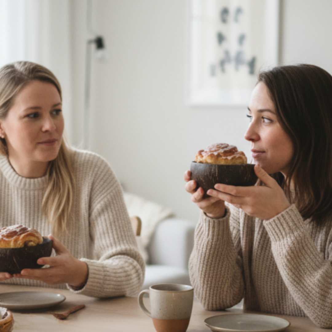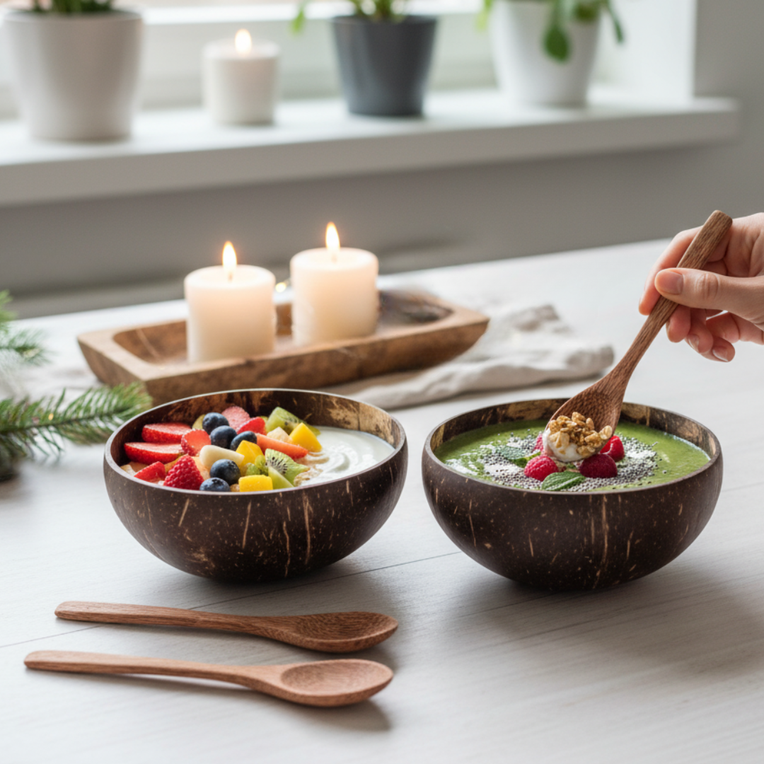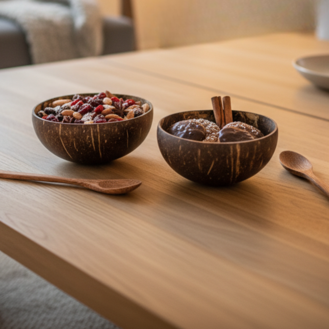 Diese zwei Kokosnuss Schalen sind super und praktisch! Perfekt für ein gemeinsames Frühstück am Wochenende mit meinem Mann. Ein Muss für alle, die Natur lieben!
