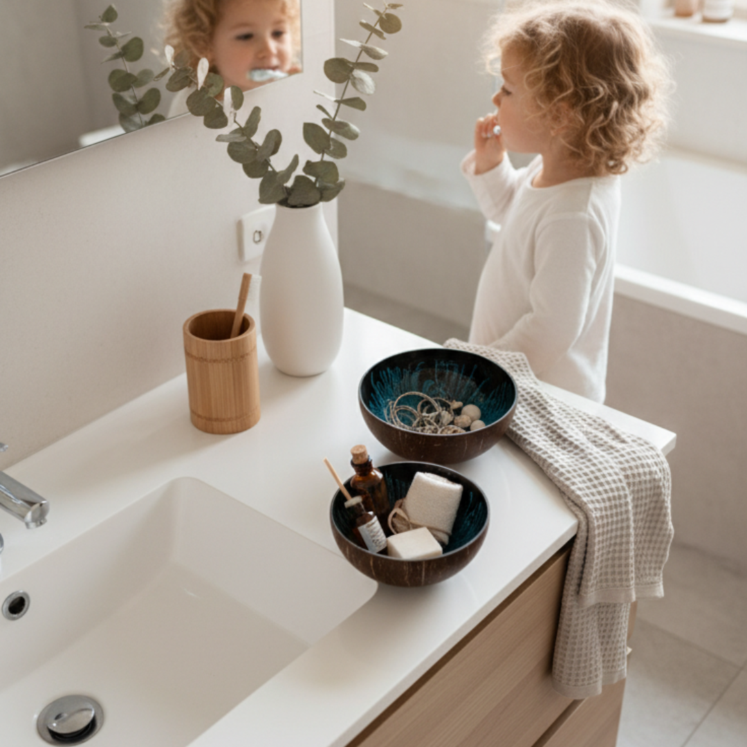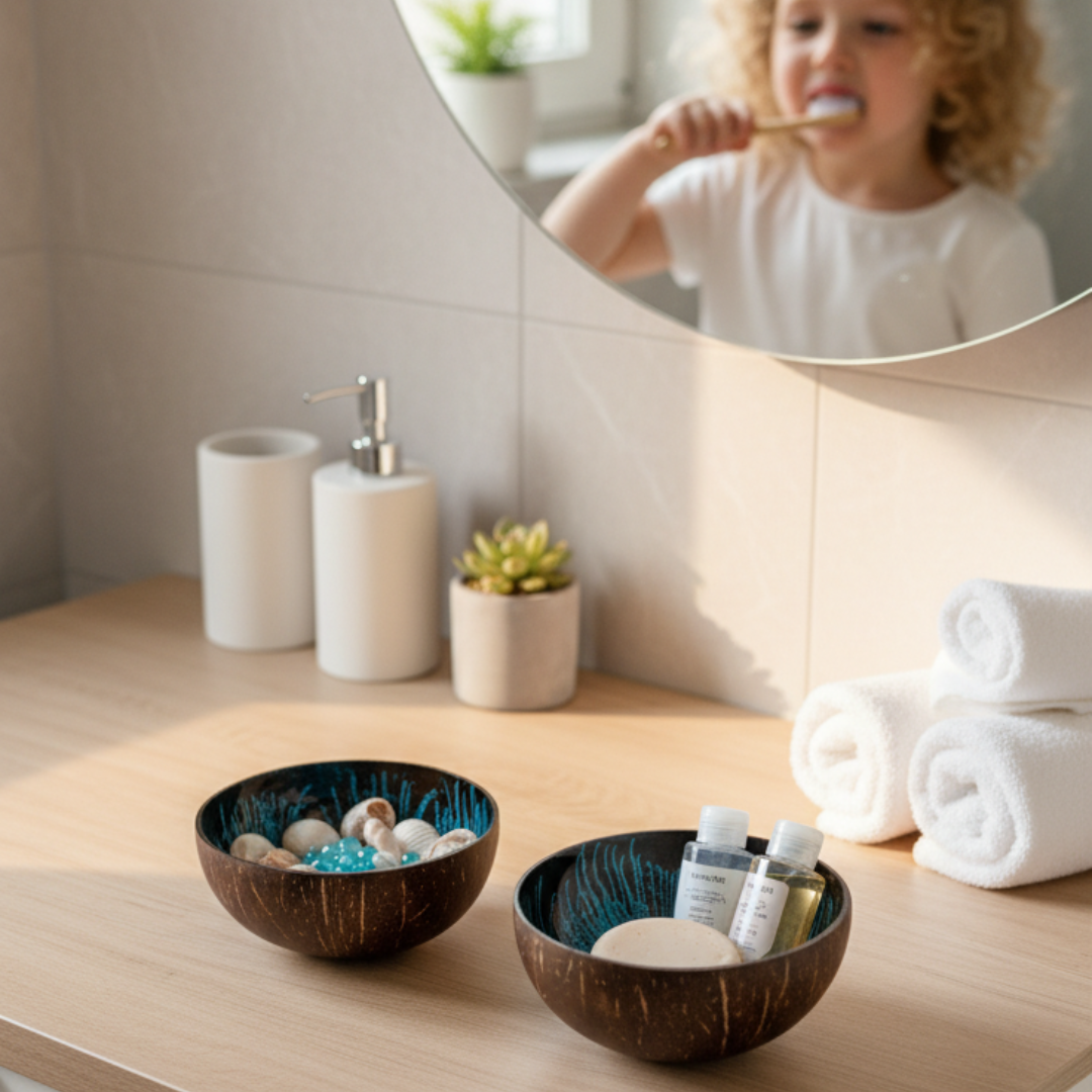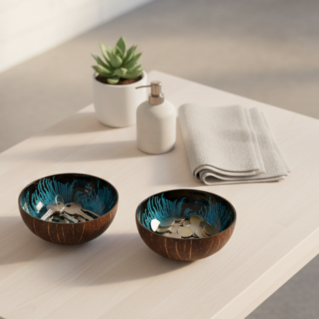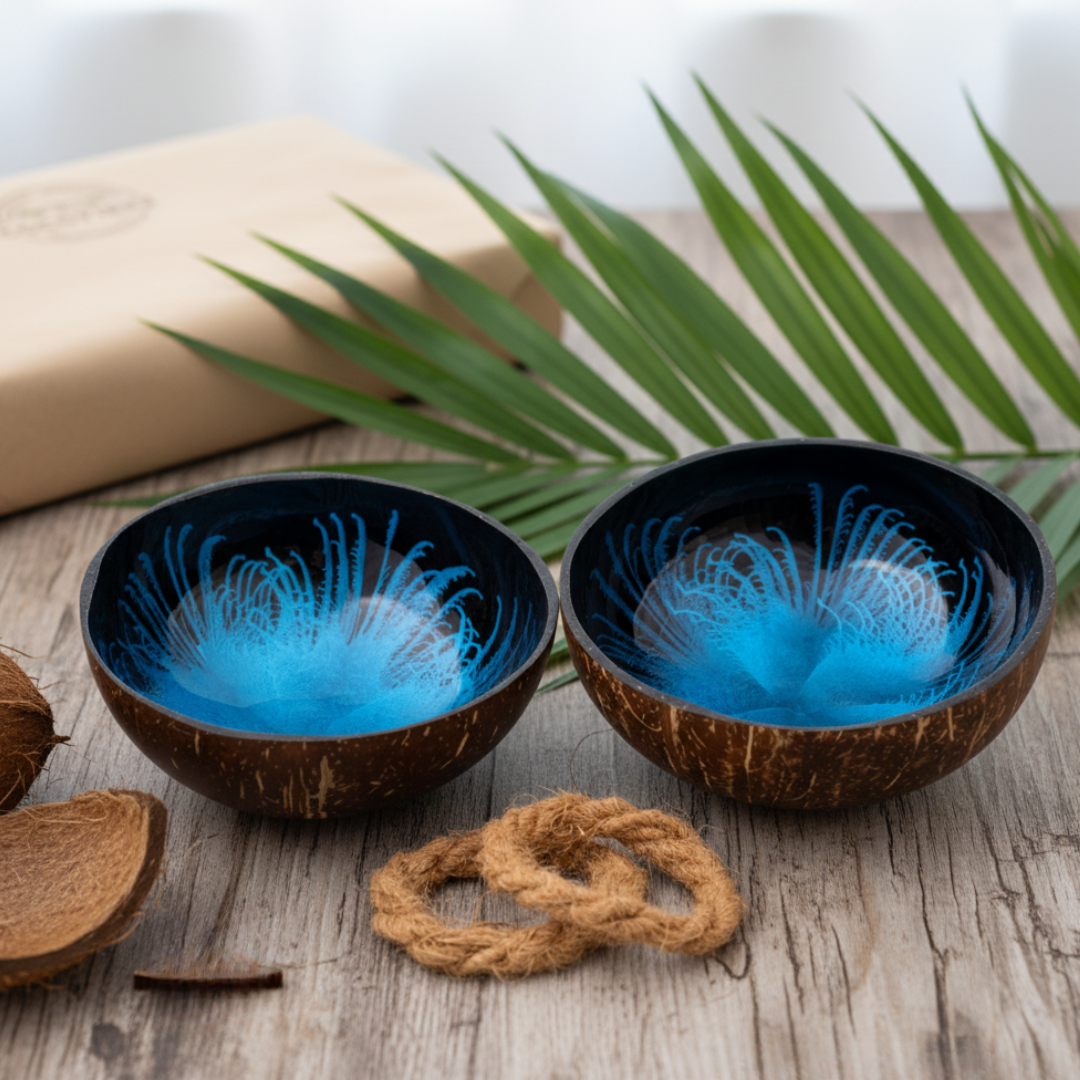 Die zwei Kokosnuss Schalen „OCEAN“ im strahlenden Meeresblau, sind ein wahres Schmuckstück und erinnern an die tiefblaue Farbe des Edelsteins „Blue Ocean“. Lass Dich von dieser faszinierenden Farbe verzaubern und fühle Dich wie am Meer.