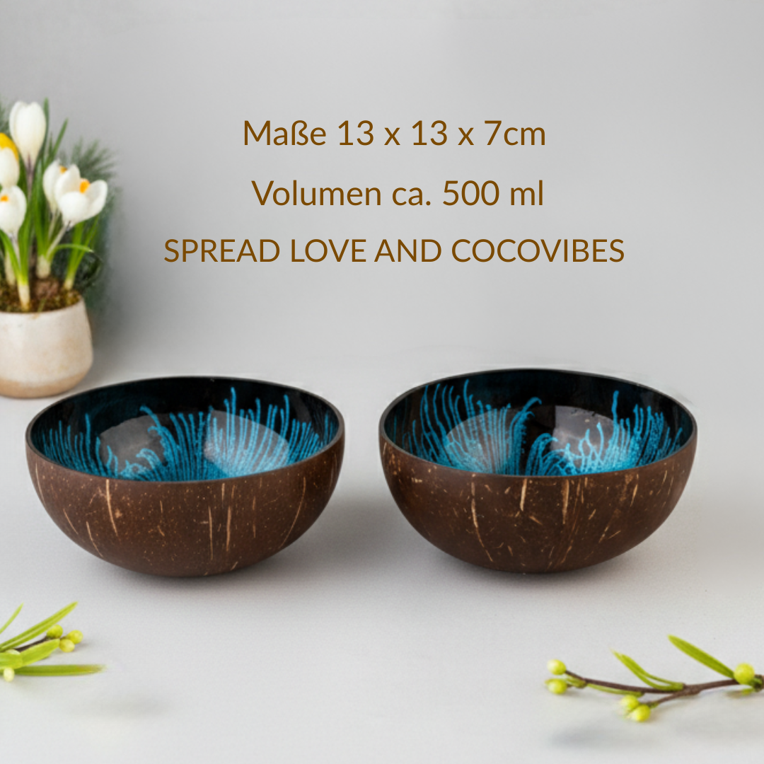 - 2 handgefertigte Kokosnuss Schalen aus upgecycelten Kokosnussschalen mit einer lebensmittelechten Splash Lackierung in blau-schwarz