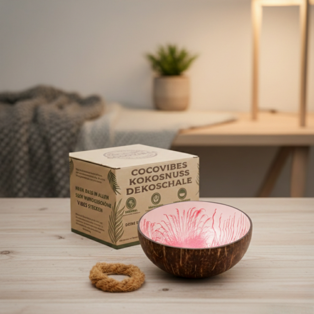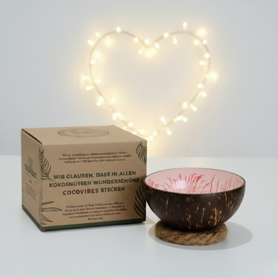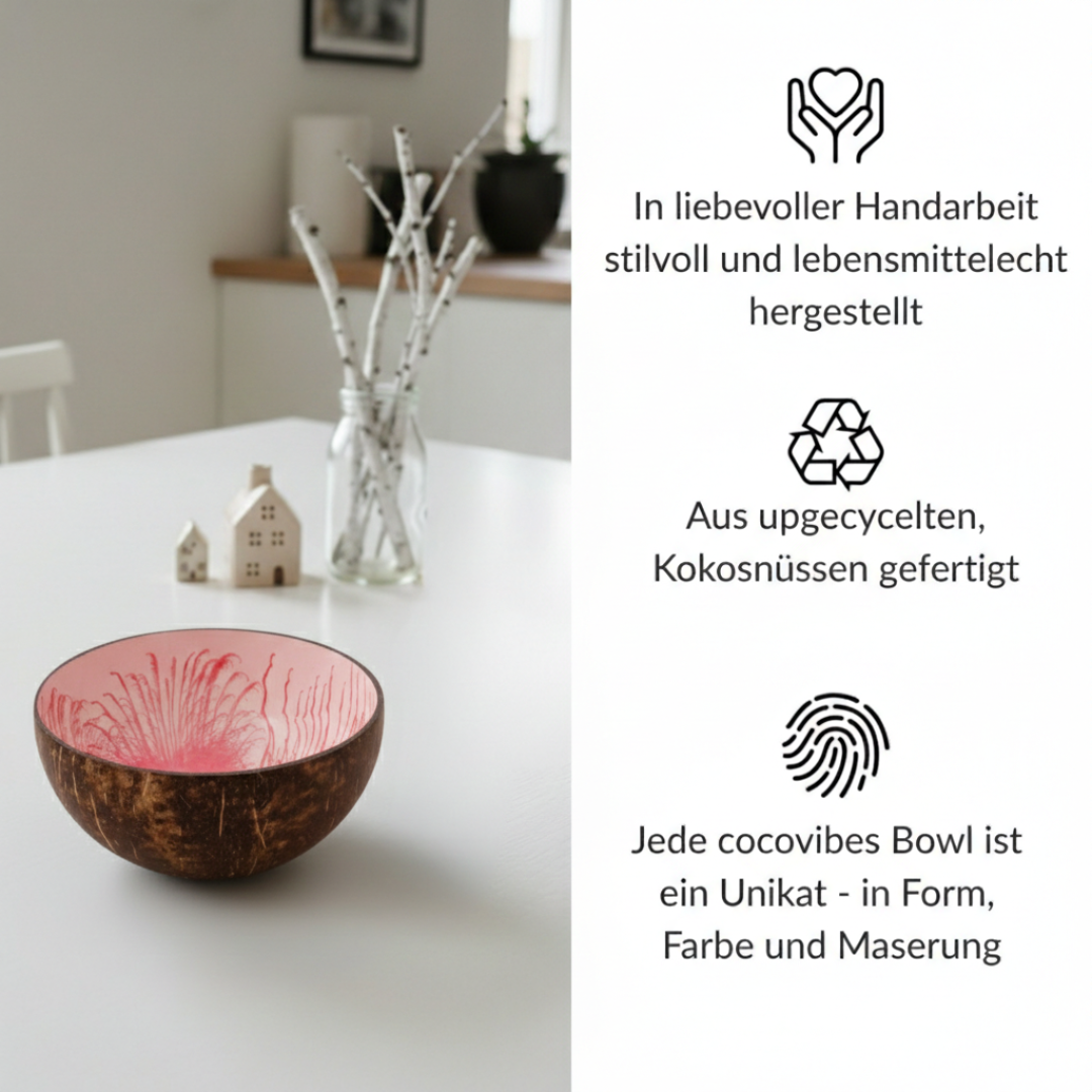 - eine handgefertigte Kokosnuss Schale aus upgecycelten Kokosnussschalen mit einer besonderen und umweltfreundlichen Splash Lackierung in rosa-weiß