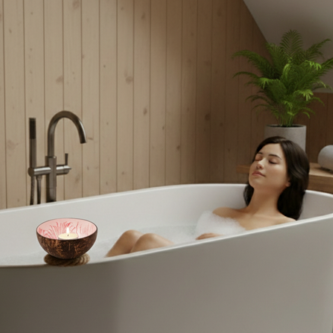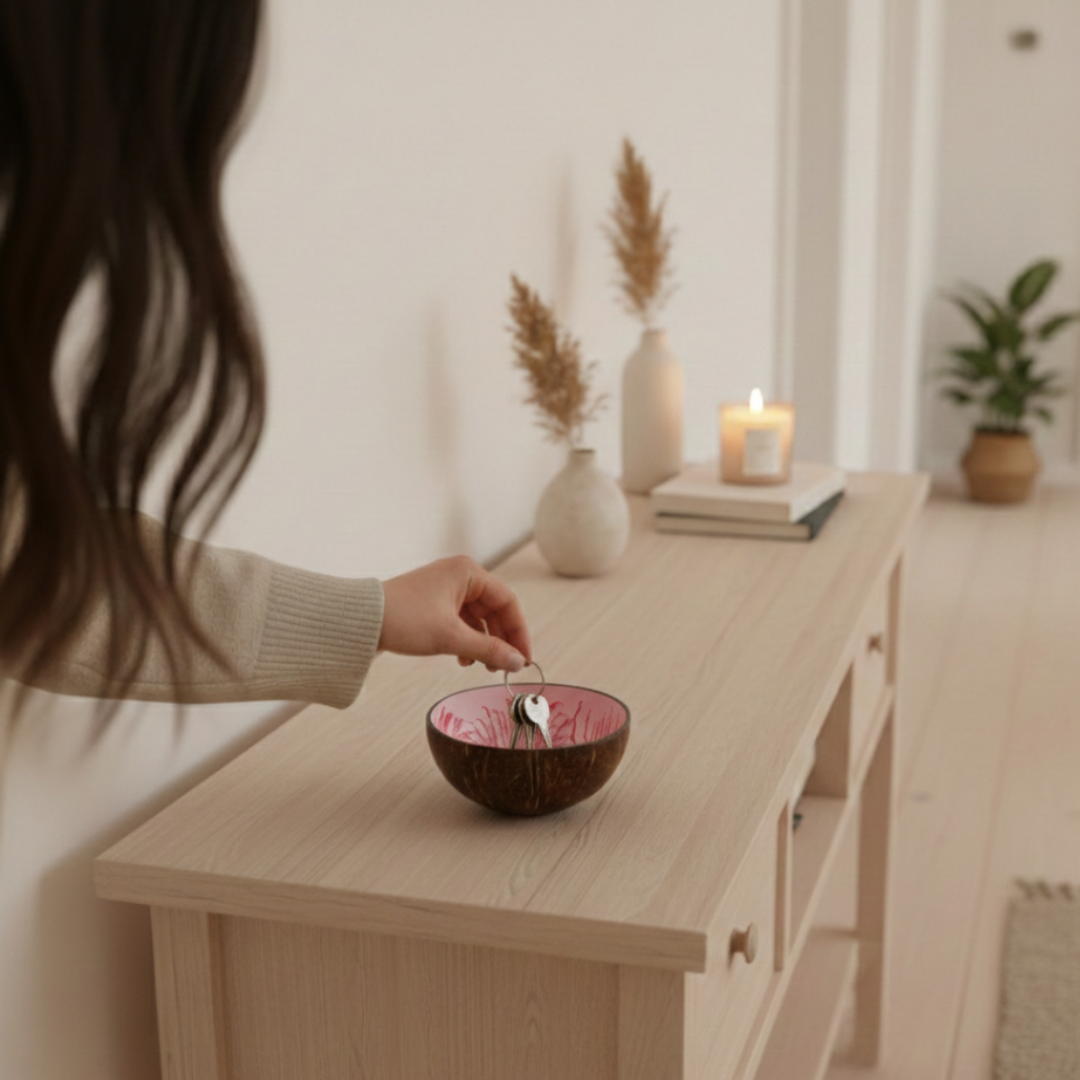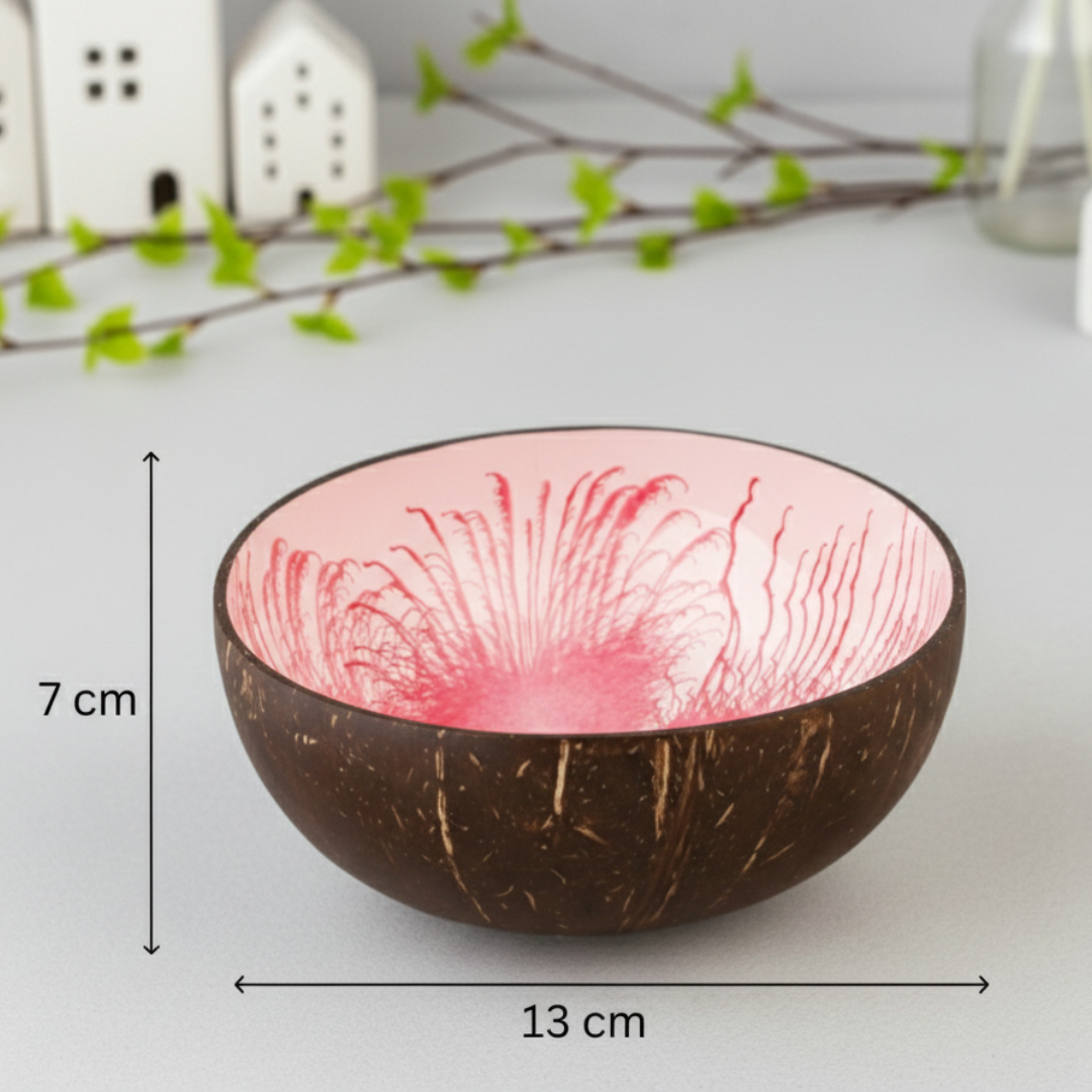 - eine handgefertigte Kokosnuss Schale aus upgecycelten Kokosnussschalen mit einer besonderen und umweltfreundlichen Splash Lackierung in rosa-weiß