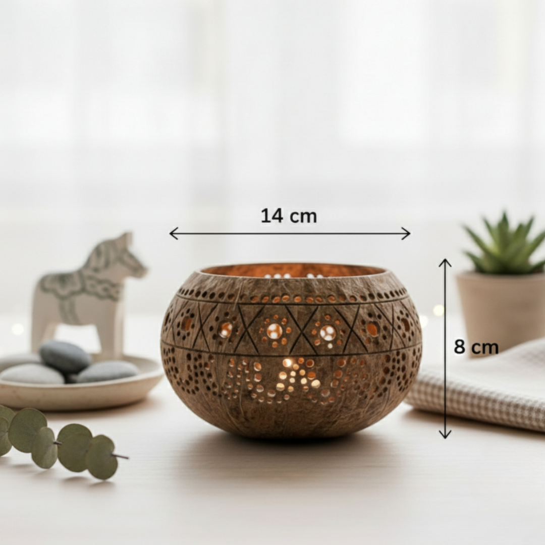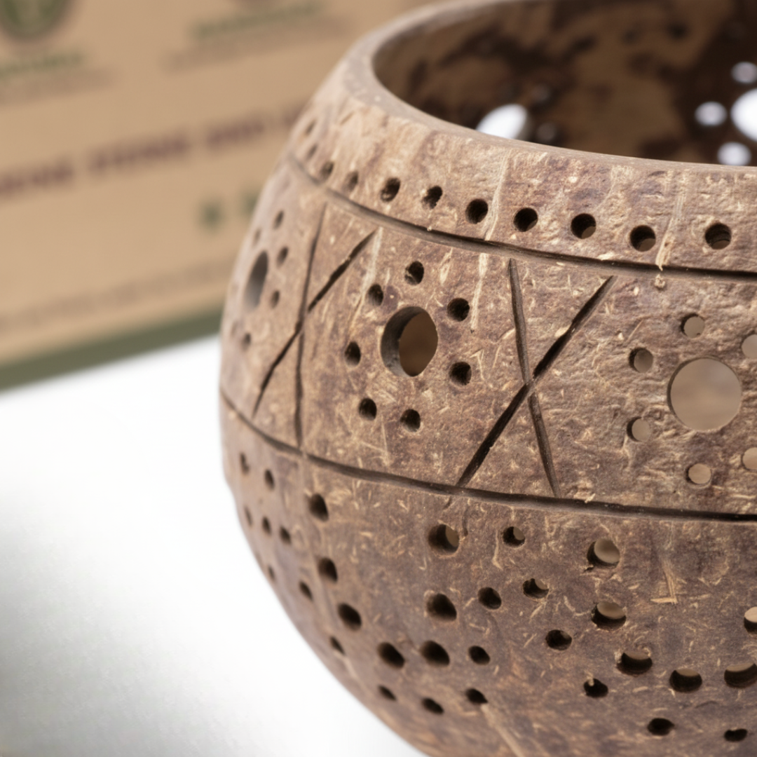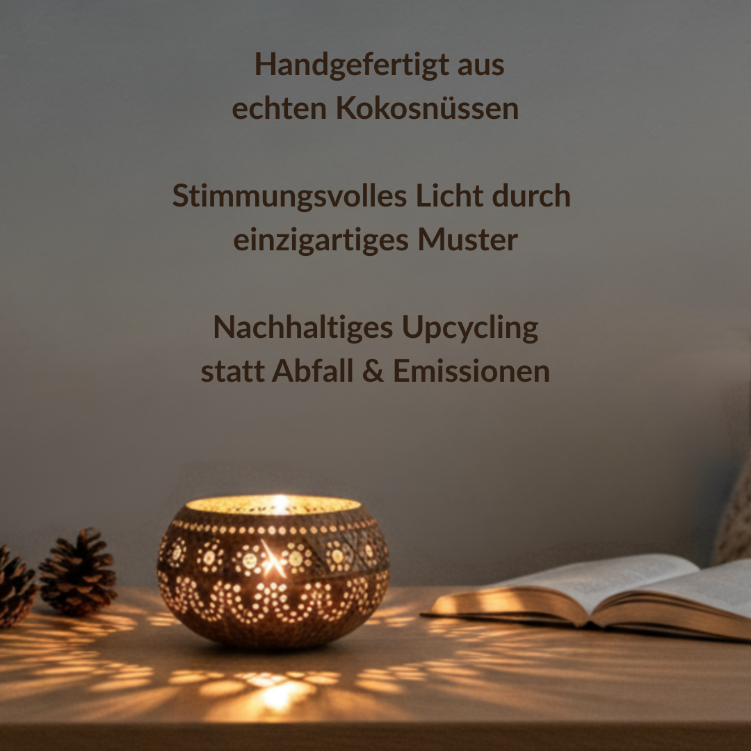 - ein handgefertigtes Kokosnuss Windlicht aus einer upgecycelten Kokosnussschale mit kunstvoll gefertigten Verzierungen