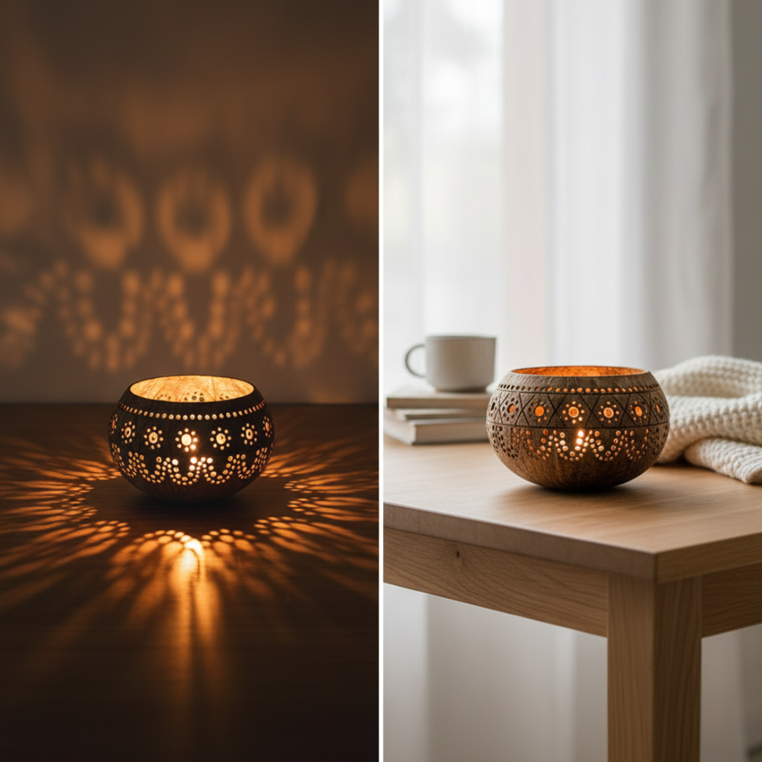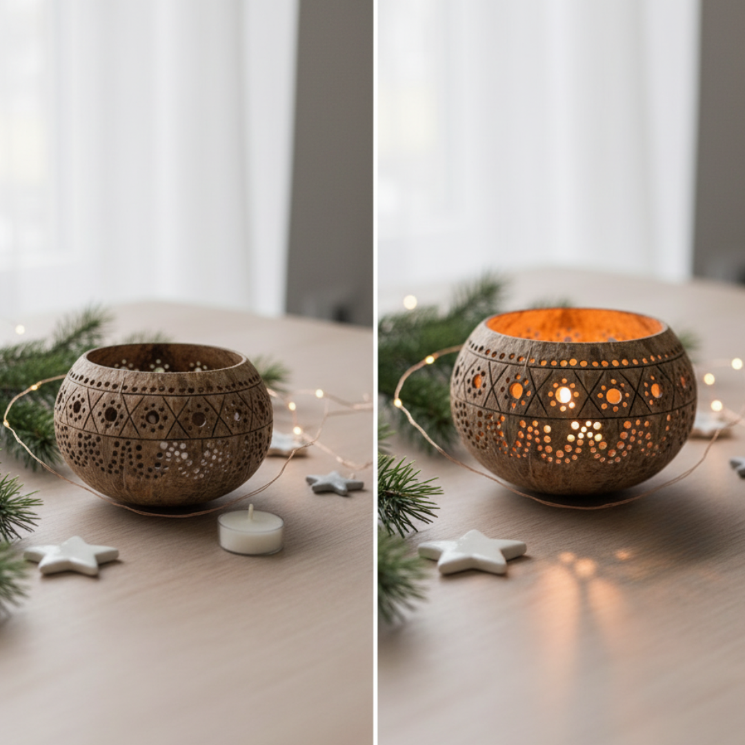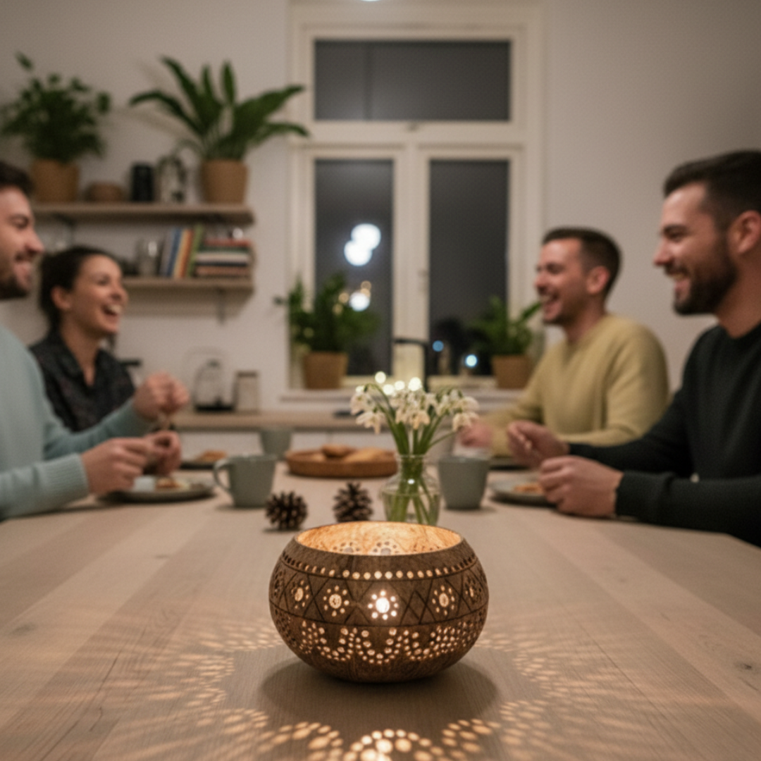 - ein handgefertigtes Kokosnuss Windlicht aus einer upgecycelten Kokosnussschale mit kunstvoll gefertigten Verzierungen