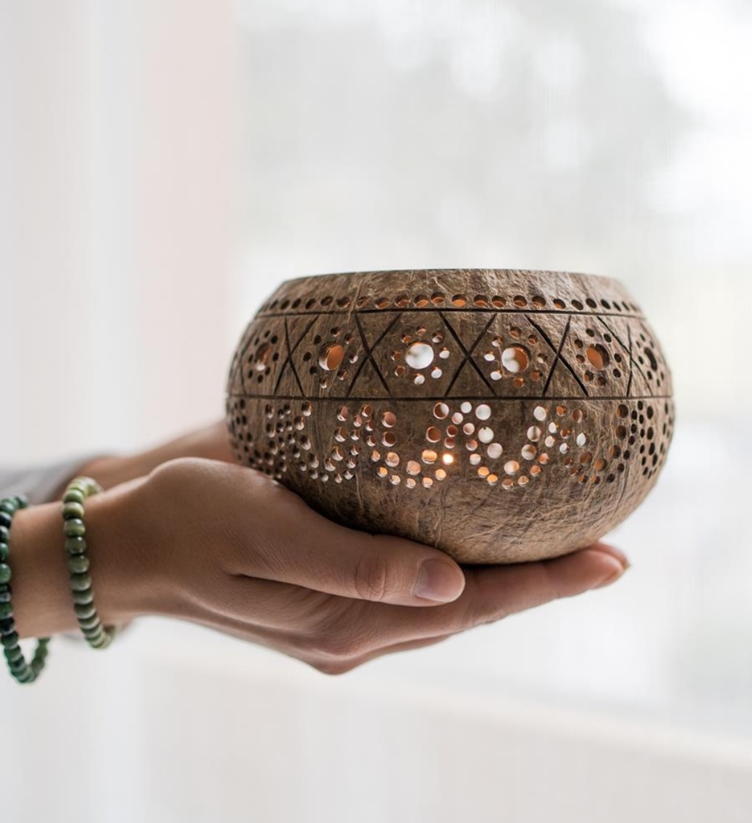 Unser Windlicht ‚HIPPIE‘ aus 100% echter Kokosnuss ist mit filigranen Ornamenten versehen, die einen wunderbaren und romantischen orientalischen Spirit in Dein Zuhause bringen. Durch die unzähligen, von Hand eingearbeiteten Perforierungen, entstehen faszinierende Muster aus Licht und Schatten.